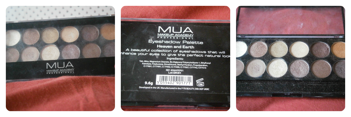 The MUA eye shadow palette in Heaven and Earth is amazing if you are just getting into make-up because the variation of colours means you can do most anything with your eye shadow and make it look professional. It is only £4 and you get 12 highly pigmented eye shadows which aren't to chalky.